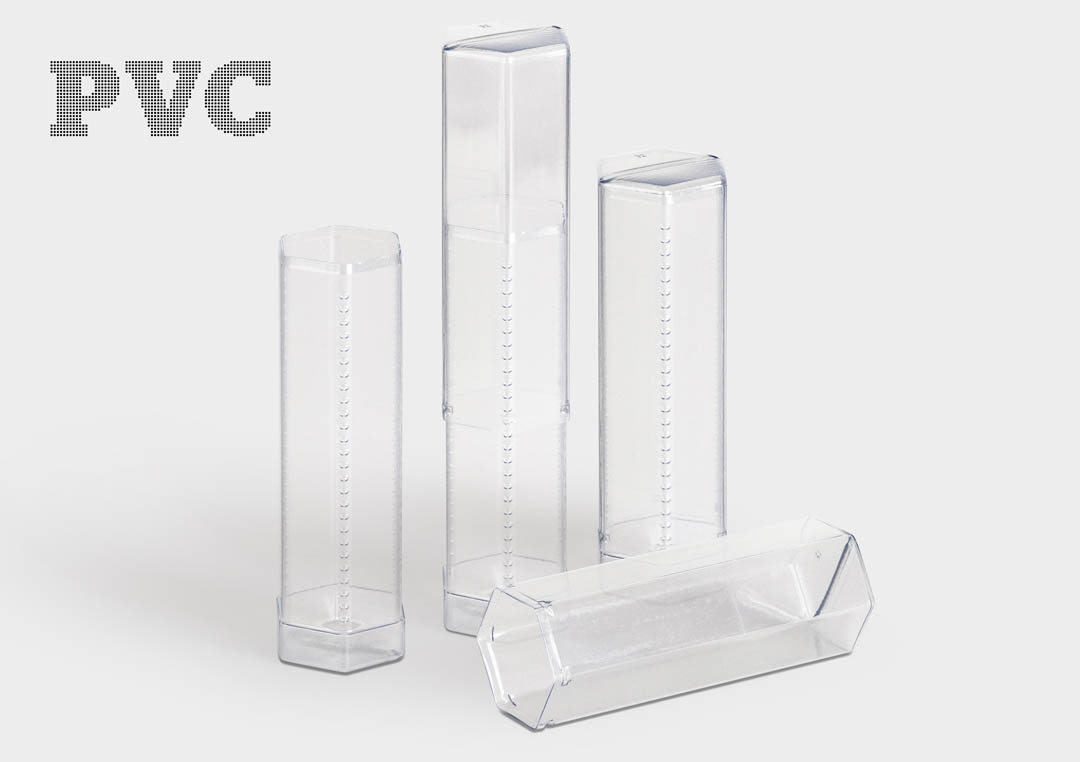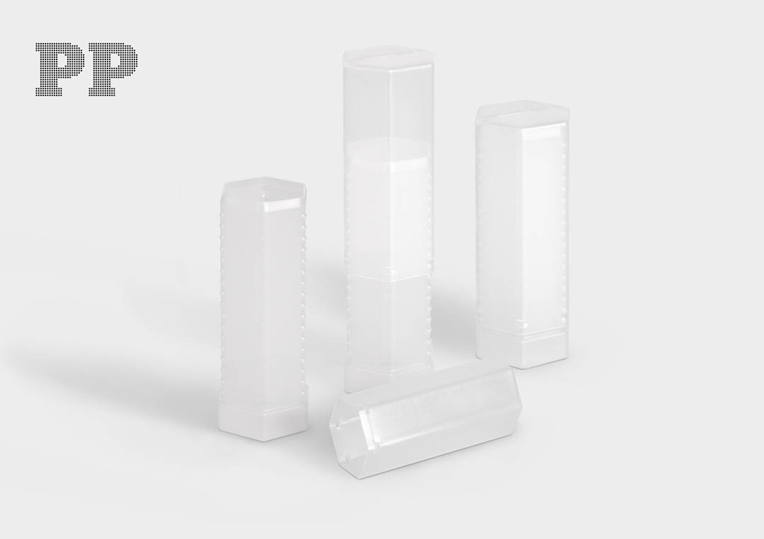 Sechseckige Verpackungshülsen aus Kunststoff mit Rastermechanik-Längenverstellung.